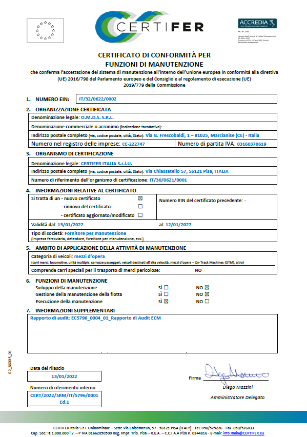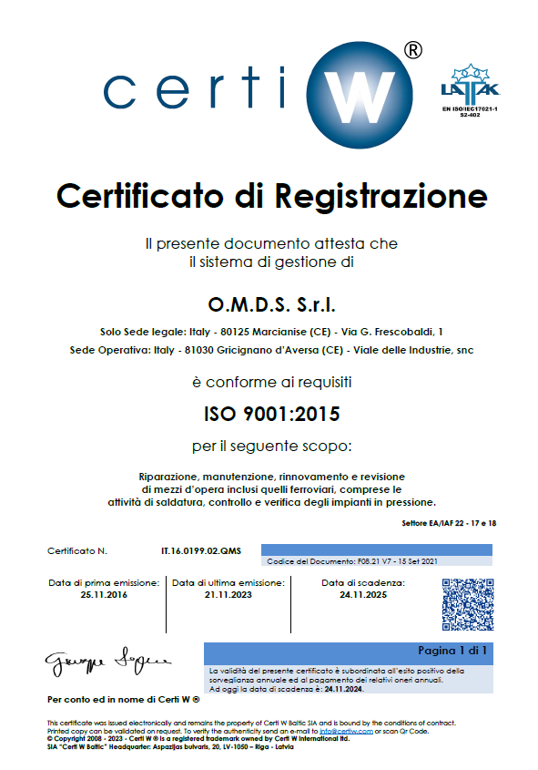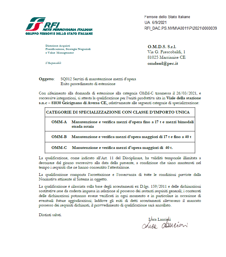 O.M.D.S. S.r.l. è qualificata da Rete Ferroviaria Italiana per le categorie: